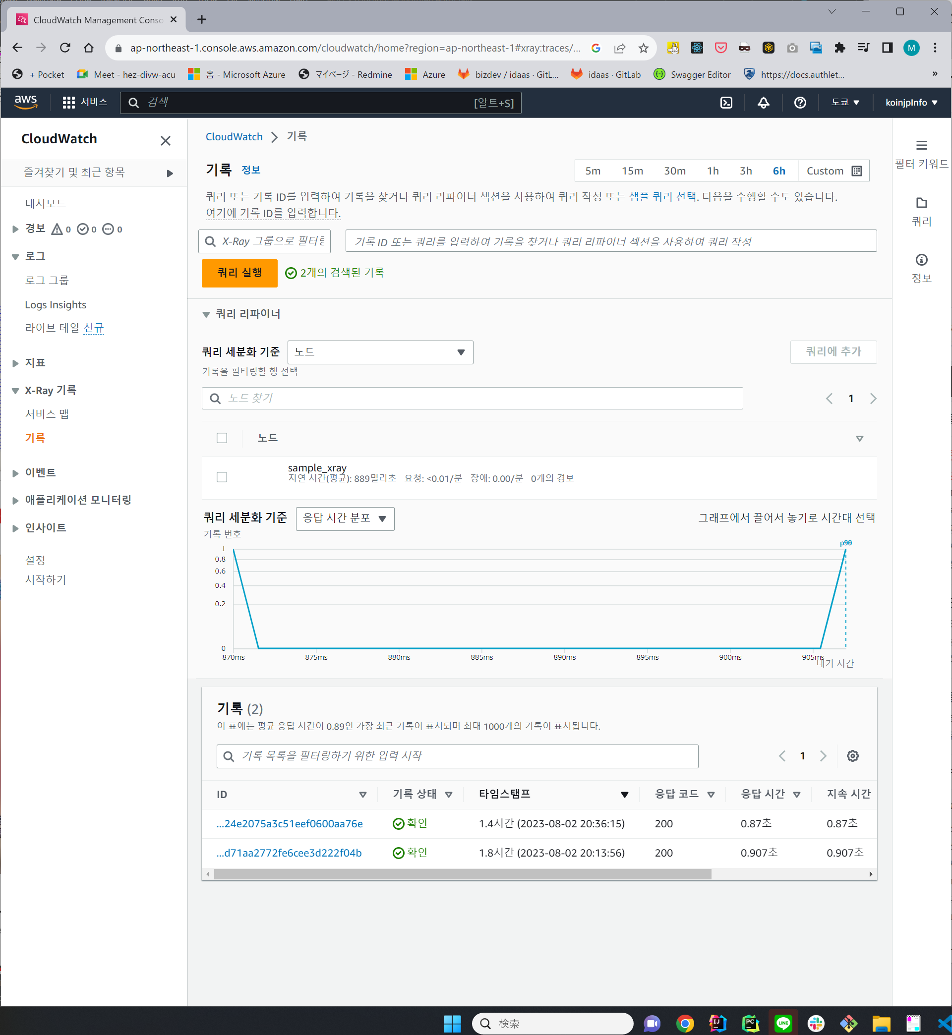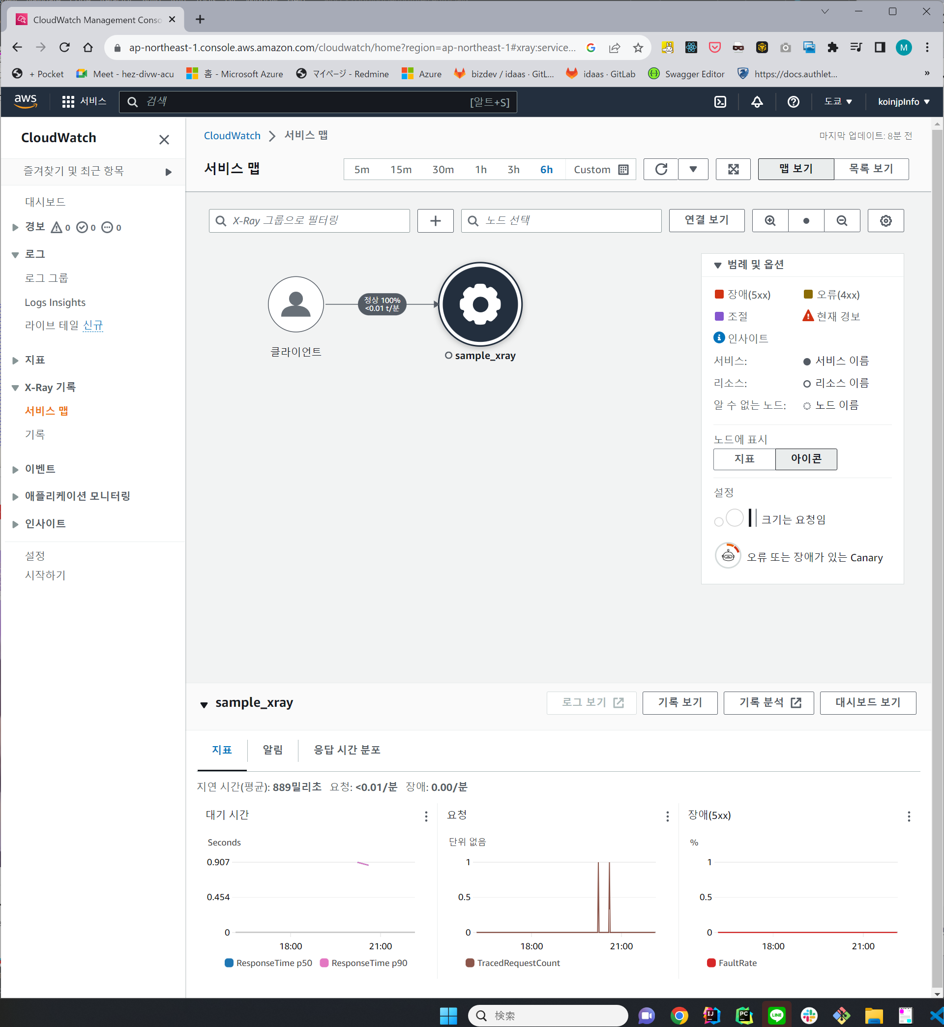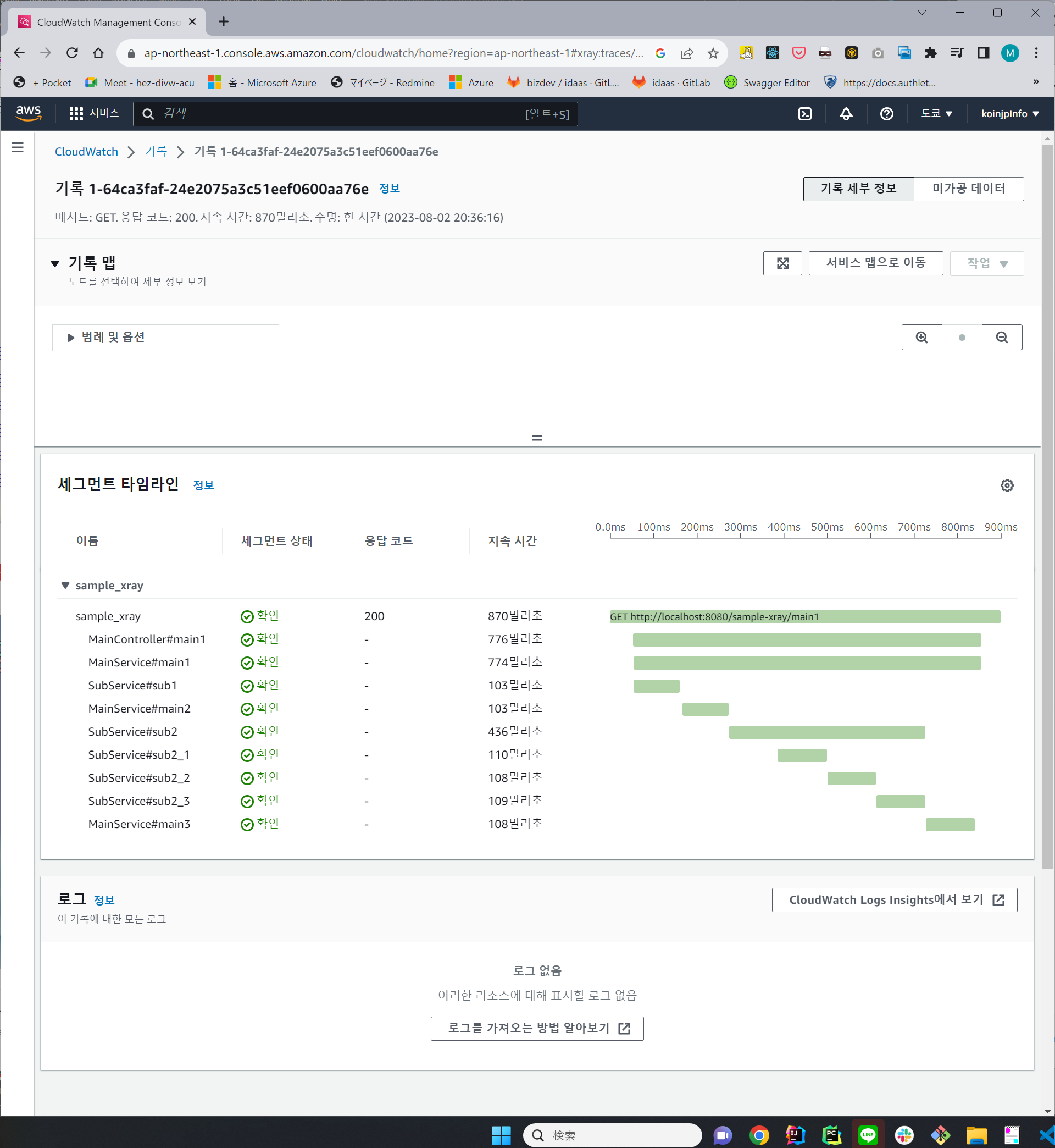 로그에 대한 부분도 있는데, 현재 상황에서는 개인계정의 X-Ray만 이용하고 CloudWatch에 로그는 남기지 않아서 연결된 로그를 확인할 수 없다.