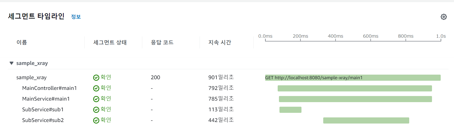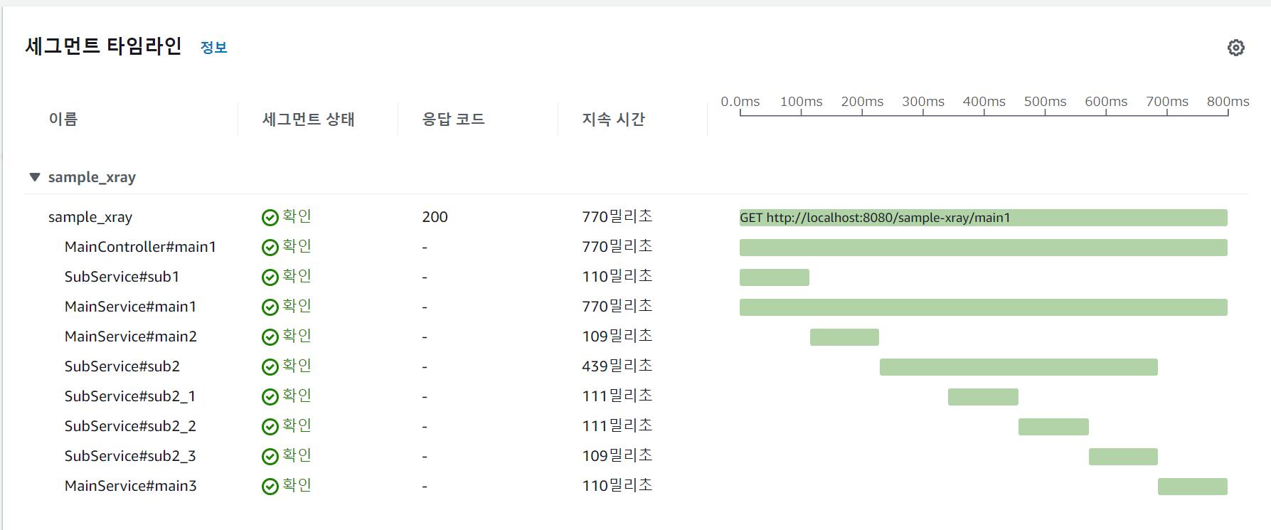 세그먼트의 Document.name "sample_xray"가 표시되고, 서브 세그먼트의 name인 "MainController#main1", "SubService#sub2_2"도 표시되는 것을 알 수 있다.