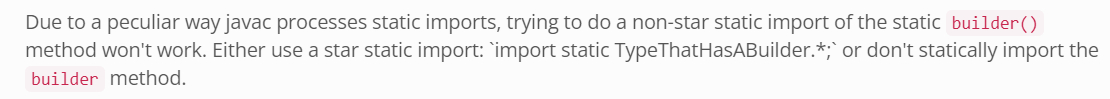 - 이제서야 lombok의 문서를 살펴보니 static import를 하면 *로 해야지 빌더를 직접 import를 하면 안된다고 함.
