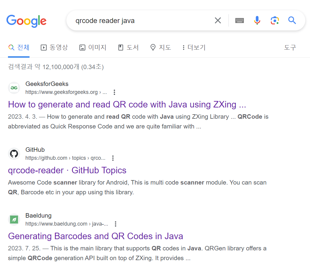 - 라이브러리는 'qrcode reader java'로 검색하면 나오는 결과 중 가장 위에 있고 많이 들어본 ZXing부터 동작실험을 하기로 함.