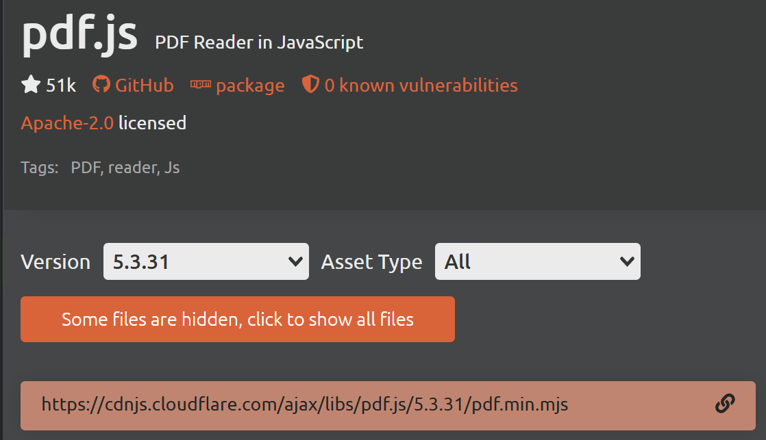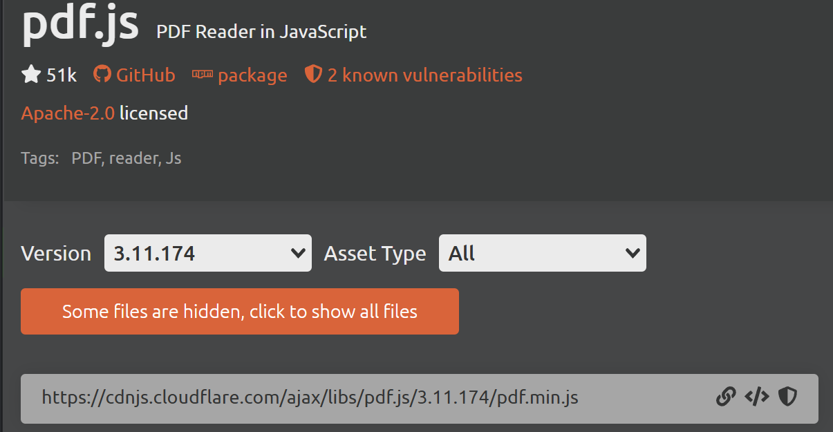 - 프로젝트에서 PDF.js라는 라이브러리를 이용하여 PDF를 출력하고 있었는데 오래된 버전이라 취약점이 보고되었다.