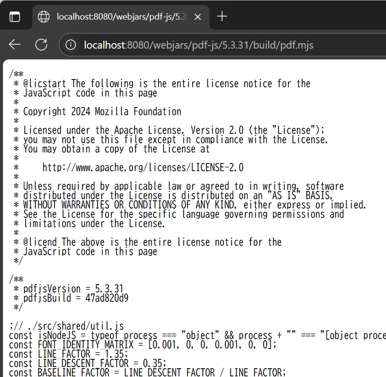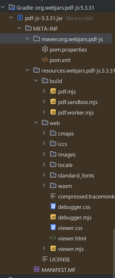 - 그래도 destDir에 대한 정보를 얻었으니 webjars/pdf-js/5.3.31/build/pdf.mjs이라는 경로에서 mjs를 읽을 수 있다는 것을 확인하였다.